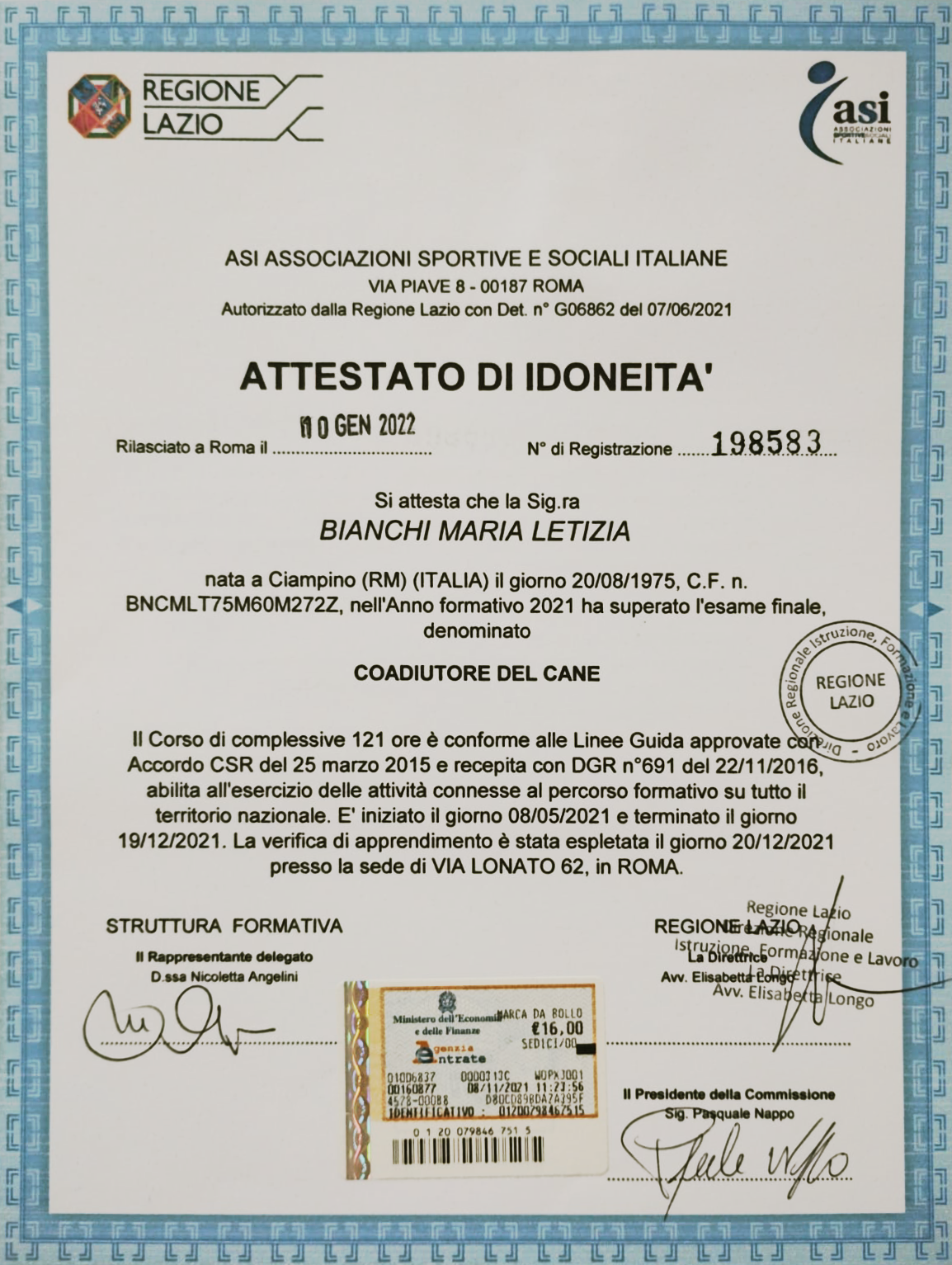 Nel 2022 ho ottenuto l'abilitazione come coadiutore del cane negli Interventi Assistiti con gli Animali. Il coadiutore del cane ha un ruolo chiave nella mediazione della relazione con l’animale in seduta. Infatti, ha il compito di facilitare il dialogo e la reciproca conoscenza tra il fruitore e il cane coinvolto.